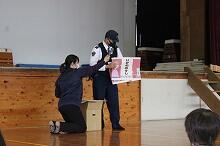 それぞれの学級で、命を守る行動として教室の戸締まりをした後避難経路を確認しながら整然と体育館に避難しました。警察の方に立ち会っていただき、不審者に扮した職員を迅速に確保する訓練も行いました。体育館に移動した後、警察の方から不審者対策の合い言葉「いかのおすし」をもとに、不審者に遭遇したときの適切な対処の仕方を学びました。