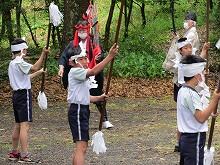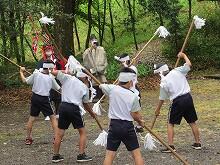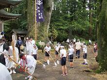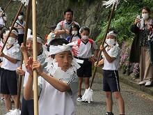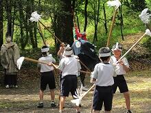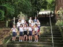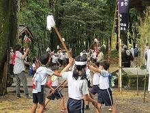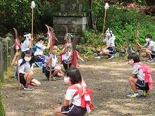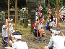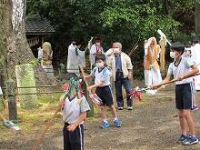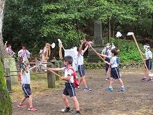 5月5日(水)、校区内にある八幡大神社(下野八幡神社)の春の例大祭がありました。新型コロナウイルス感染症拡大防止のため内容を縮小しての実施でしたが、小学生が棒術と長刀踊りを披露しました。午前中は雨が降っていましたが、子どもたちが取りを披露する頃には雨も上がり、境内には木漏れ日も差していました。