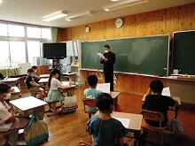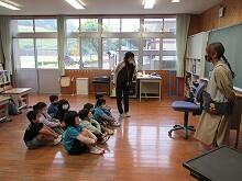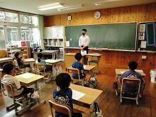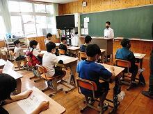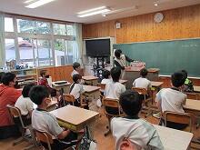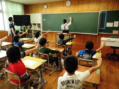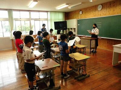 小学校では、3・4年生が外国語活動を毎週1時間、5・6年生が外国語の授業を毎週2時間行い、ALTの先生と高千穂小学校所属の外国語専科の先生に来ていただいています。下の写真は5時間目の6年生の外国語の授業のようすです。子どもたちはお二人の先生の英語に合わせながら発音したり、英語で短い文を発表したりしていました。