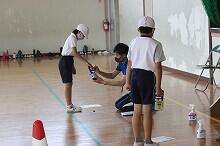 ソフトボール投げの距離や反復横跳びの回数などを測る”体力テスト”を運動場と体育館で行いました。全校児童をグループ分けし、6年生が後輩を連れて移動し、それぞれの種目の場所ごとにみんなで挨拶をしてテストを受けていました。