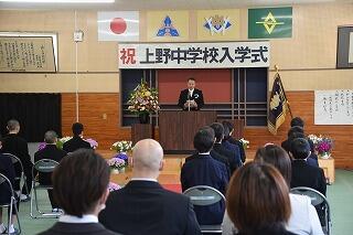 4月9日(火) 武道場にて、今年度新たに上野中学校に入学する新入生7名の入学式を行いました。