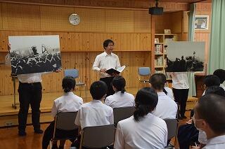7月17日 中学生の平和学習として、サラみやざきの皆さんによる朗読劇「蒼天のむこうへ」が行われました。