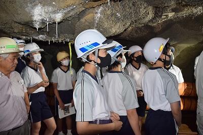 すずを採取していた土呂久鉱山跡の大切坑の視察を行いました。講師として高千穂町役場建設課の方に来ていただき、普段は閉鎖されていて入ることができない坑道内の案内をしていただきました。