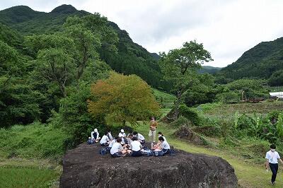 校外学習の途中、きれいに削られた石舞台の上で昼食をとりました。