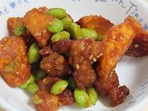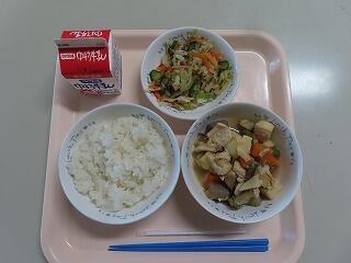 麦ごはん 鶏肉と青豆の揚げ煮 茄子のみそ汁 牛乳