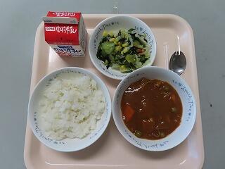 麦ごはん ドライカレー ひじきとチーズのサラダ 牛乳