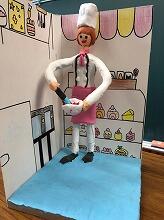 小学6年生が図工の時間に「将来、自分がしたい仕事」を粘土細工で表現しました。児童と作品を一緒に撮った写真が階段に掲示してありました。