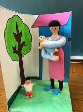 小学6年生が図工の時間に「将来、自分がしたい仕事」を粘土細工で表現しました。児童と作品を一緒に撮った写真が階段に掲示してありました。