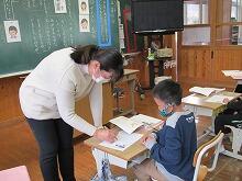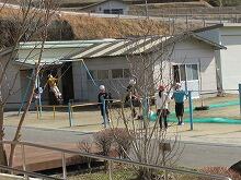 金曜日の午後の授業。運動場では小学5・6年生が体育の授業でティーボールをしていました。その横を小学2年生が帰っていきます。