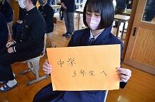 県立高校推薦入学者選抜検査の願書受付が始まりました。また来週は私立高校の入試も行われます。いよいよ入試本番です。今日は入試直前の中学3年生を応援するために生徒会の計画で激励集会を行いました。集会では、代表生徒が激励の言葉を述べ、その後、3年生の合格を祈って1・2生から手作りのミサンガを渡しました。
