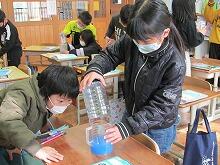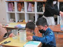 小学3年生が算数の授業で「小数」の勉強をしていました。子どもたちはこの時間が「小数」を勉強する最初の時間で、その概念をイメージするために、絵の具で色をつけた水を目盛りのついた容器に移しながら、整数や分数、そして小数で考えていきました。