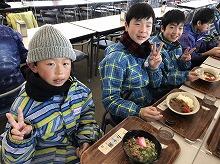 雪山体験学習の午前の部が終わり、昼食の写真などが届きました。スキーやスノボードを楽しんでいるようです。
