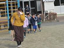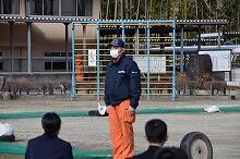 西臼杵消防署に協力していただいて、校舎内での火災を想定した避難訓練を本日行いました。火災発生後は教室から運動場に避難し、その場で消防士の方から火災に関する話をしていただきました。その後、機械で煙を発生させて充満させて教室を通りました。明るい教室をまっすぐに進むだけでしたが、煙で前が見えないことを子どもたちは学ぶことができました。
