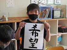 小学5年生の3・4時間目の授業は「書写」でした。今日の授業では、楷書で「希望」と書き、先生の指導を受けながら何度も練習して書いていました。線が太く、力強く書いている児童が多いと思いました。