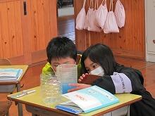 小学3年生が算数の授業で「小数」の勉強をしていました。子どもたちはこの時間が「小数」を勉強する最初の時間で、その概念をイメージするために、絵の具で色をつけた水を目盛りのついた容器に移しながら、整数や分数、そして小数で考えていきました。