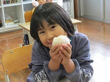 小学2年生は、生活科の授業で、ガラス瓶に入れた籾(もみ)を棒で突き、玄米にしました。今日はその玄米と5年生が稲刈りをした米を一緒に炊き、おにぎりを作って実際に食べました。子どもたちの表情からわかるように、とても美味しいおにぎりでした。