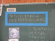 高千穂小学校の栄養教諭の先生にお越しいただき、小学1年生の教室で「食に関する授業」をしていただきました。テーマは「元気に過ごすための食べ方」でした。1年生が考えやすいように絵をたくさん使っての説明でした。授業の終わりには、この時間に勉強したことのまとめとして、これからどのような工夫をして苦手なものを食べるか一人ずつ発表しました。