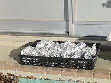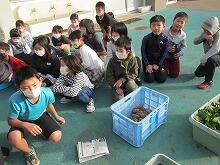 焼き芋は運動場の端に穴を掘り、そこに木と落ち葉を入れて火をつけ、火が弱まったところでぬれた新聞紙とアルミホイルでくるんだサツマイモを入れて焼きました。今日の焼き芋のために、子どもたちは校庭の落ち葉も集めていました。