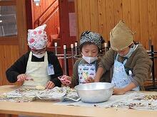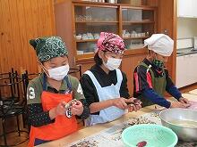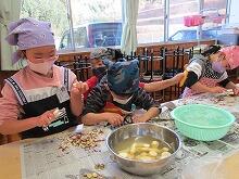 焼き芋が焼き上がるまでの時間、小学1・2年生は生活科の授業で「ふかし芋の茶巾絞り」を作りました。子どもたちはピーラーを使ってサツマイモの皮をむくところからしました。