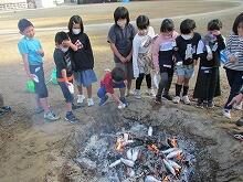 焼き芋は運動場の端に穴を掘り、そこに木と落ち葉を入れて火をつけ、火が弱まったところでぬれた新聞紙とアルミホイルでくるんだサツマイモを入れて焼きました。今日の焼き芋のために、子どもたちは校庭の落ち葉も集めていました。