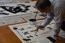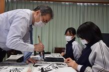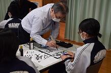 先ずはじめに、講師の方から漢字の成り立ちについて説明していただいた後、子どもたちの前で大筆で大きな条幅紙に見事な書の実技を披露していただきました。一作品が仕上がる度に生徒から拍手が沸き起こっていました。
