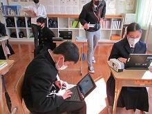 1時間目の中学1年生の教室では、社会科の地理の授業で、ブラジルの森林の減少について勉強していました。授業では二つのテーマでグループに分かれ、原因や森林の減少を止めるための政策についてインターネットで調べ、タブレットを使ってまとめていました。同じテーマの生徒と一緒にまとめたり発表したりするために、マイクロソフトチームスを使っている生徒の姿に頼もしさを感じました。