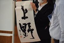 先ずはじめに、講師の方から漢字の成り立ちについて説明していただいた後、子どもたちの前で大筆で大きな条幅紙に見事な書の実技を披露していただきました。一作品が仕上がる度に生徒から拍手が沸き起こっていました。