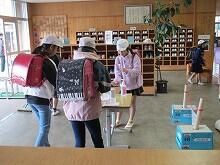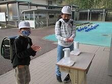 上野小・中学校の児童・生徒用玄関には自動噴霧消毒器が置いてあり、登校した子どもたちが使っています。これは、日本教育公務員弘済会宮崎支部様が、県内のすべての小中学校に寄贈してくださったものです。新型コロナウイルス感染症は現在落ち着いている状況ですが、今後、感染が増える可能性はあります。これからも気を緩めずに、消毒やマスク着用を徹底するためにもこの消毒器は役に立ちます。ありがとうございました。