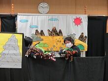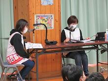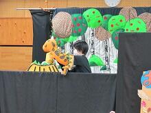読み聞かせボランティアグループ「おはなしの森」の皆様に、小学生全員を対象とした読み聞かせをしていただきました。読んでいただいた本は「だるまさんがころんだ」「にくのくに」「はらぺこあおむし」「カシャ」「あなたをずっとずっとあいしてる」です。ただ読むだけではなく、だるまさんの絵をいっしょに傾けたり、大型テレビへの絵本の投影、大型絵本とぬいぐるみを使った演出をしたりして子どもたちが興味をもつように工夫してありました。特に、恐竜の親子のことが書いてある「あなたをずっとずっとあいしてる」では、ピアノ演奏をBGMにした絵本の朗読に合わせて、手作りのぬいぐるみを使った人形劇もありました。こどもたちは人形劇を食い入るように見つめ、絵本の世界に夢中になっていました。