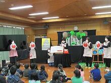 読み聞かせボランティアグループ「おはなしの森」の皆様に、小学生全員を対象とした読み聞かせをしていただきました。読んでいただいた本は「だるまさんがころんだ」「にくのくに」「はらぺこあおむし」「カシャ」「あなたをずっとずっとあいしてる」です。ただ読むだけではなく、だるまさんの絵をいっしょに傾けたり、大型テレビへの絵本の投影、大型絵本とぬいぐるみを使った演出をしたりして子どもたちが興味をもつように工夫してありました。特に、恐竜の親子のことが書いてある「あなたをずっとずっとあいしてる」では、ピアノ演奏をBGMにした絵本の朗読に合わせて、手作りのぬいぐるみを使った人形劇もありました。こどもたちは人形劇を食い入るように見つめ、絵本の世界に夢中になっていました。