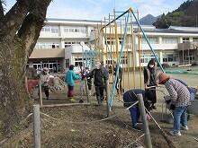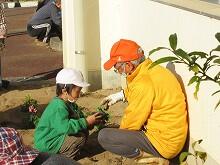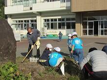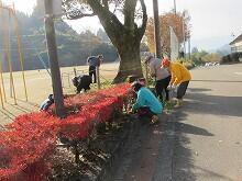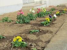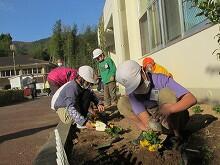 今日は地域の方にお越しいただき、小学1・2年生がパンジーやビオラ、キンギョソウ、ノースポールなどの花の苗を一緒に植えました。1時間目の活動でしたが、皆様のご協力で早く終わり、残った時間は除草作業や落ち葉掃きまでしていただきました。