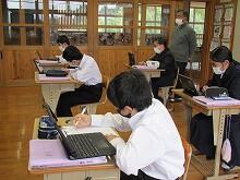 上野小・中学校は校内研究の取組として、「ICTの活用」をテーマとした職員の相互参観授業を今月は行っています。今日の1時間目には、中学1年数学の授業を参観しました。