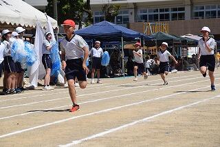 会場では、本校職員が給水用の水筒を置いたり旗竿のおもりなどを設置しています。