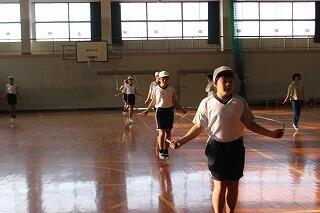自由跳びでは、上野体育館では100秒間計測、武道場では60秒間計測しました。高学年になるほど、最後まで跳び続けられた子どもたちが多いようでした。体育の授業中だけではなく、昼休みや朝の時間等を利用して目標を持って練習してきた、子どもたちの主体性が磨かれた朝の活動となりました。