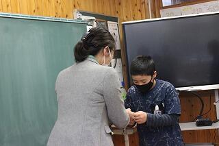 高千穂町総合政策課の甲斐美穂様、甲斐有香様にお越しいただき、小学6年生への卒業記念品として、菊宮神社の倒木を利用した「木製しおり」の贈呈式が実施されました。本日の企画には、祖母傾大崩ユネスコパークに育つ子どもたちへ「世界に誇る高千穂の自然で育ったという自覚と誇り、愛着、自信を子どもたちに育む機会を提供したい」といった思いが込められています。