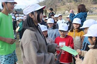 子どもたち一人一人に「倒木しおり」が贈呈されました。