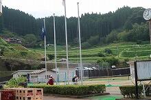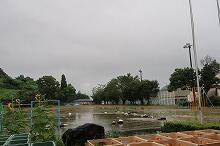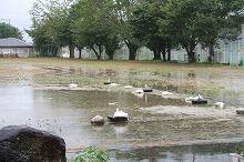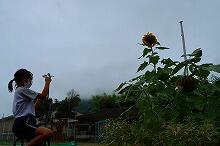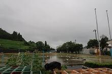 今朝の上野は曇り空で、子どもたちが登校してきた時間には小雨が降り始めました。2時間目には雷鳴が響き、強い雨が降りました。小学5年生が植えたイネは成長し色づいてきていましたが、先日の台風で倒れてしまっています。予定を変更して、明日、稲刈りを予定していますが、今日の雨で延期するかもしれません。