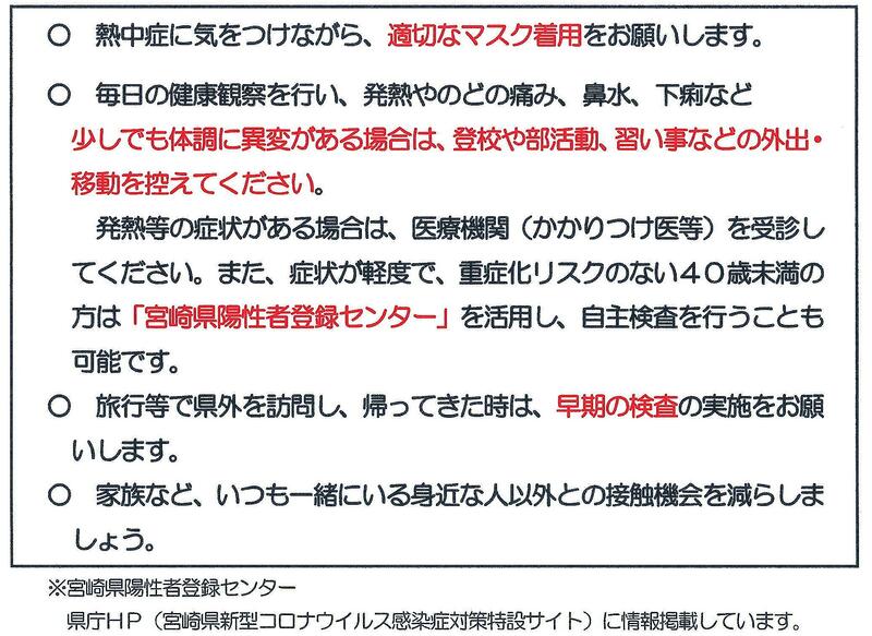 新型コロナウイルスの感染者数が県内で急増し、高千穂町内も同様に増えています。宮崎県教育委員会より保護者の皆様に向けた文書が届いておりました。感染拡大防止対策の徹底をお願いいたします。