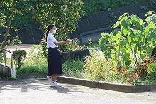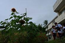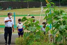 自転車小屋近くの花壇には小学1・2年生が植えた野菜、そして職員室前の花壇には小学4年生が植えたヘチマの果実がそれぞれ実をつけています。写真は少し前のものですが、よく育っています。この夏は、茄子がよく育っています(撮影者談)。以前紹介したスイカは、2個残っています。