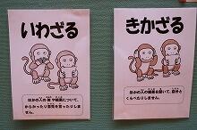 高千穂小学校の玄関には、校長先生のコーナーやマスコットキャラクターを使った挨拶や校舎内の歩行を確認する掲示物がありました。