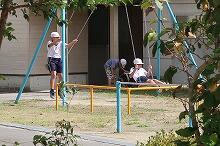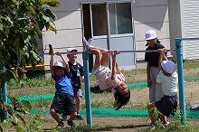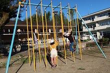 今日の上野は雲が多いものの晴れています。運動場では、小学1・2年生が体育の授業で鉄棒の練習をしています。