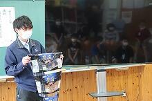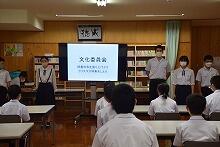 今朝、中学校では1時間目の授業の前に委員会集会を行い、11月・12月の生徒会や委員会活動について役員の生徒が説明しました。また、今週末行う「文化発表会スローガン」の横断幕も披露しました。
