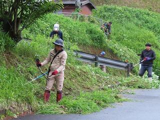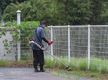 さっそく作業を始めました。グランド横の植え込み、東側駐車場横、保健室前、校舎東側斜面、刈ったり集めたりした草は、軽トラックで運んでいきます。