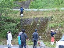 それぞれの団長さんが「かるい」を構えます。そこに、綱の一番端にいる人が球を投げて入れます。