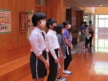 5日(金)10:40、シェイクアウト訓練用の音声を放送で流し、大きな地震が起きた時の対応を身に付けるため避難訓練を行いました。一次避難として、机の下に身を隠すなど安全確保の行動をとり、揺れが収まったことを知らせる放送で、二次避難である「安全な場所への避難」を開始し、グラウンドで全員の無事を確認しました。
