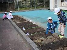 1・2年生がトマトやピーマンを植えていた花壇に、先日二十日大根などの野菜の種をまきました。芽が出て今は双葉も出ています。植えたものの種類や成長のようすを小学1年生が説明してくれました。