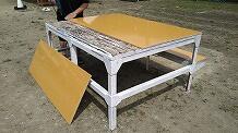 上野小中学校が現在の場所に移る前に使われていた朝礼台。金属部分の塗装が落ちて天板の板材もかなり傷んでいたので、本体は白く塗装し、天板は上に丈夫な板を張りました。