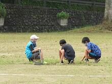 今日から2学期が始まり、子どもたちは夏休みの課題を持ち、久しぶりに登校してきました。登校して、体調確認をすませた子どもたちの中には、運動場の草取りをしている子どもたちもいました。