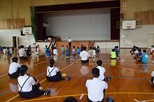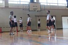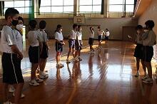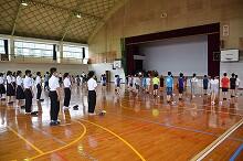 中学生の6時間目は、運動会に向けた「全校体育」でした。午後からの日差しが強かったため、上野体育館で行いました。今日の内容は、開閉会式の時の大まかな立つ位置の確認と団長・リーダーを中心としたダンスの練習でした。