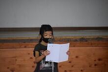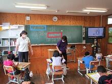 教室で朝の会を終えた子どもたちは、体育館で始業式を行いました。上野地区の体育館はバスケットボールのコートが2面とれるほど広い体育館です。今日は感染防止のために、間隔を大きく取りました。また、始業式は代表の児童1名と生徒1名による2学期の抱負発表、校長の話のみを行い、校歌は歌いませんでした。その後の諸連絡では、養護教諭が感染防止のために、マスクの正しい付け方や消毒の仕方、こまめな手洗い・うがいについて話をしました。